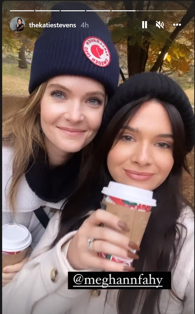 Katie Stevens and Meghann Fahy reunited in New York City today, November 21. The former The Bold Type costars were all smiles as they enjoyed their coffees in the city.