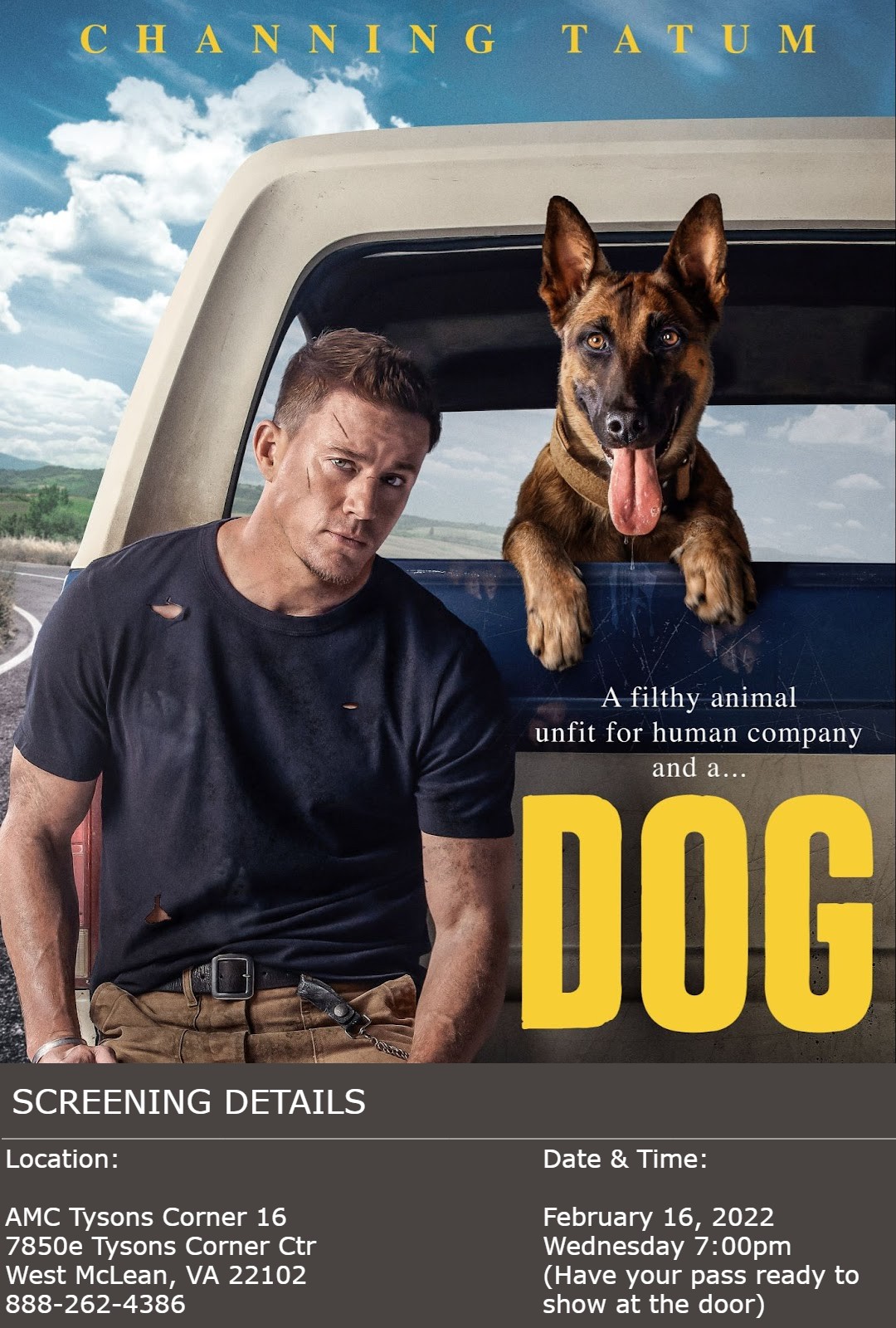 Giveaway time! BB is hosting a screening of DOG starring Channing Tatum! The screening will take place on Wednesday, February 16 at 7:00pm EST at AMC Tysons Corner in McLean, VA.