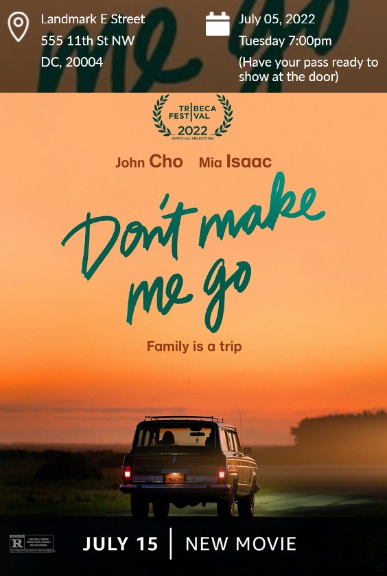 Giveaway time! BB is giving away admit 2 tickets to our advance screening of Don’t Make Me Go starring John Cho, Mia Isaac, Mitchell Hope, Jemaine Clement, Stefania LaVie Owen, and Kaya Scodelario! The screening will take place on Tuesday, July 5th on 7:00pm at the Landmark E Street Cinema in Washington, D.C..
