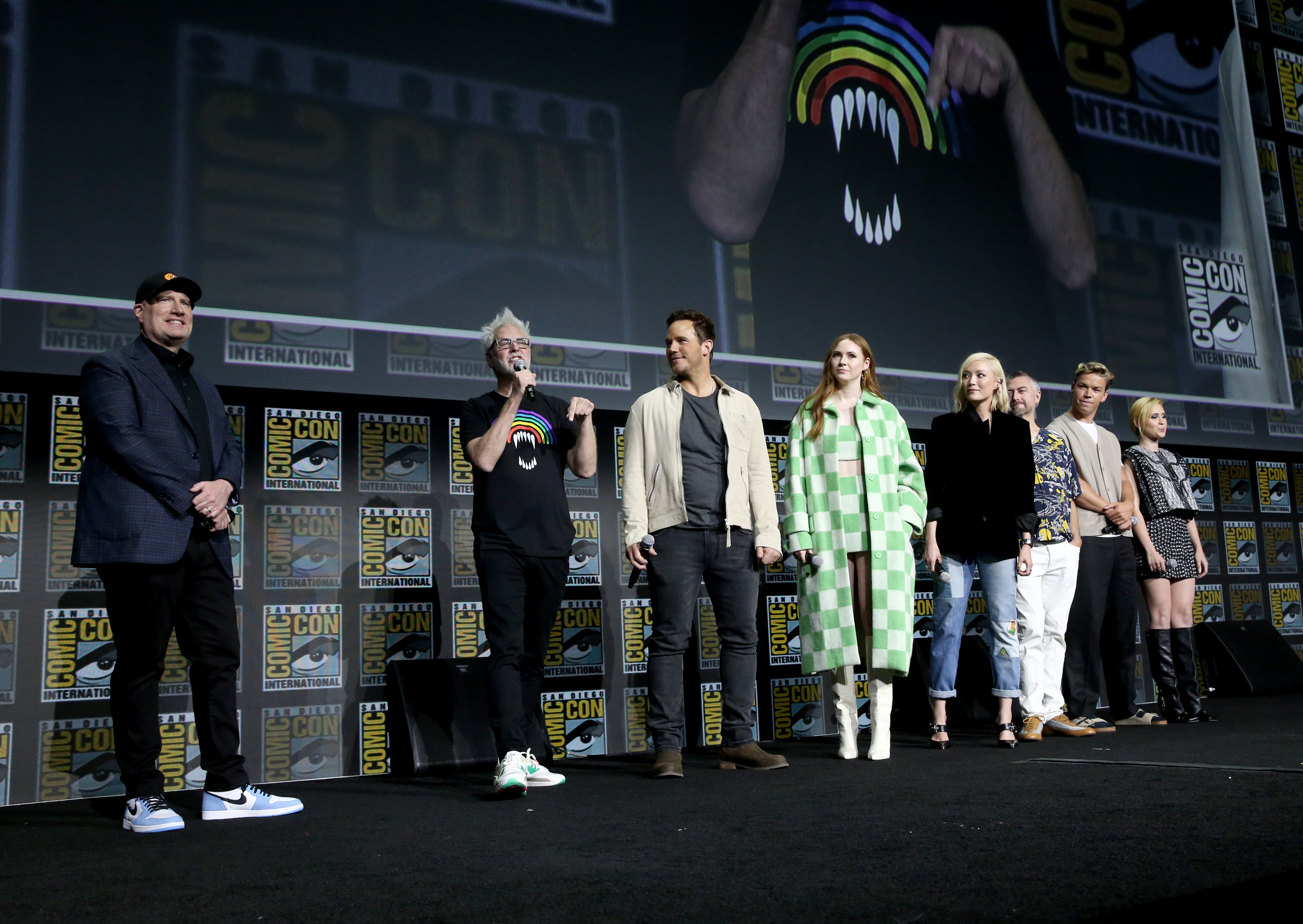 Director James Gunn was joined on stage by Chris Pratt, Karen Gillan, Pom Klementieff, Sean Gunn, Will Poulter and Maria Bakalova to talk about the next movie in the Guardians series, Guardians of the Galaxy Vol. 3. During their portion of the panel, Chukwudi Iwuji arrived on stage in costume, revealing to excited fans that he’ll be portraying High Evolutionary in the film.