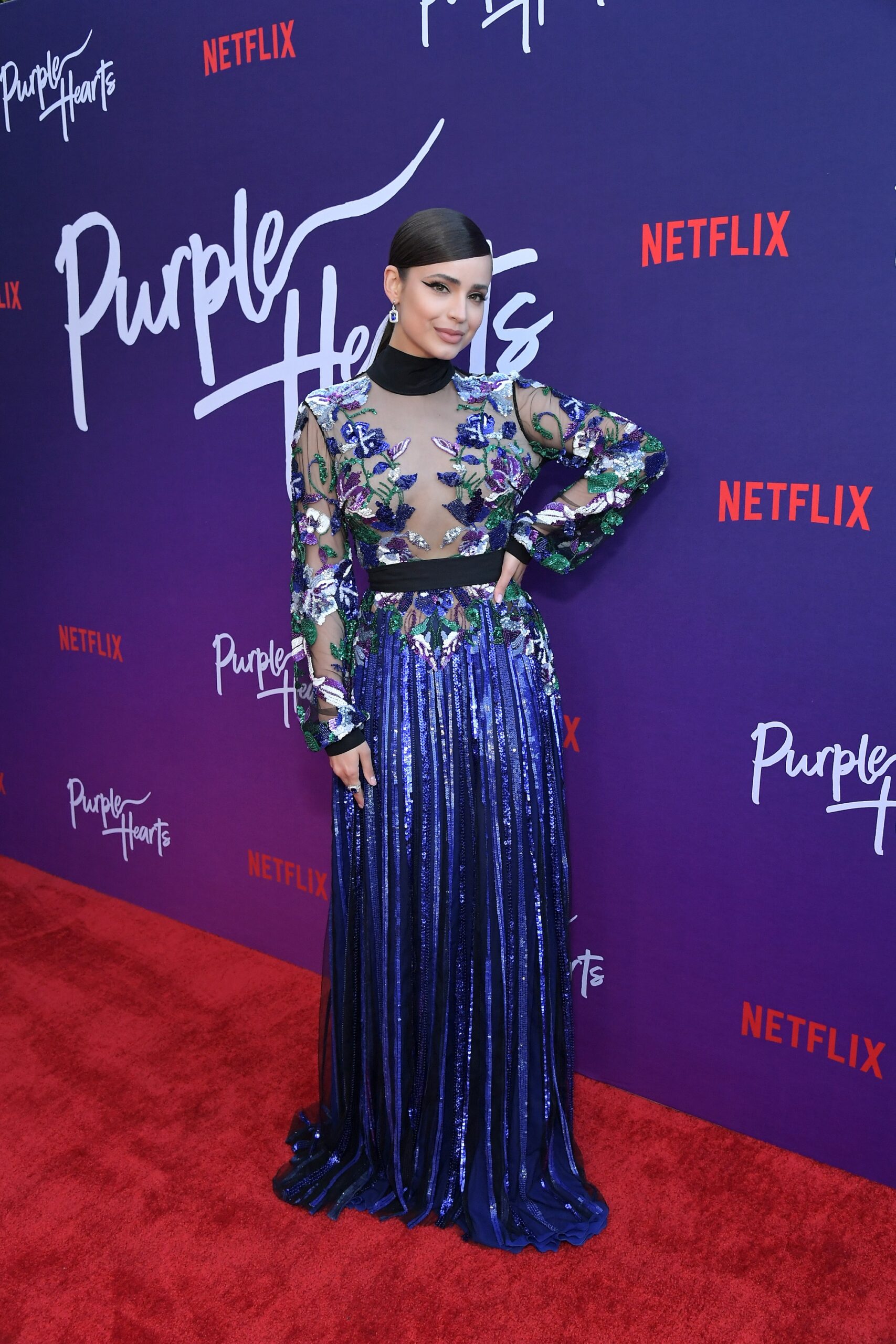 Sofia Carson attended the premiere of her new Netflix film, Purple Hearts, last night, July 22, in Los Angeles. The actress/singer was joined by her cast and crew to promote their new creation at the Bay Theater.