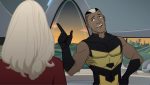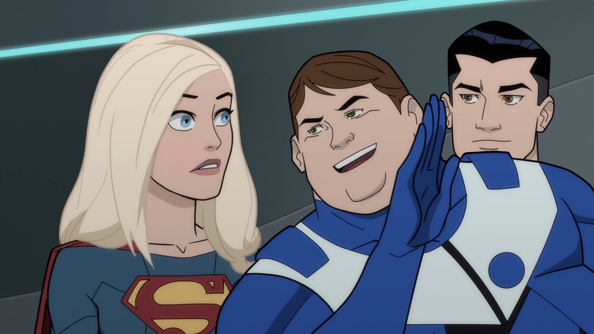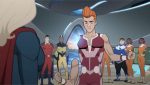 Bouncing Boy, voiced by Ely Henry (Players, Smallfoot), offers a little unsolicited insight to Supergirl, while Mon-El watches during an early scene in Legion of Super-Heroes. Supergirl is voiced by Meg Donnelly (American Housewife, The Winchesters), and Mon-El is voiced by Yuri Lowenthal (He-Man and the Masters of the Universe, Spider-Man).