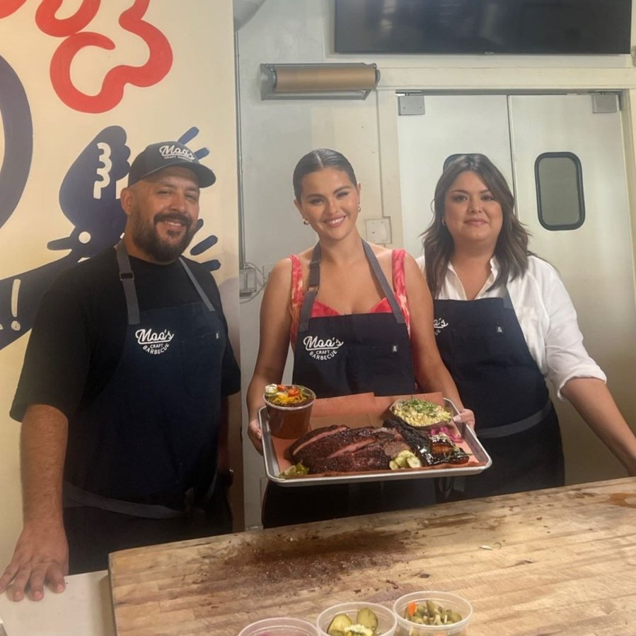 Selena Gomez recently took a visit to Moo’s Craft Barbeque in Los Angeles. The star was all smiles as she posed with the pit masters who helped make the tasty meal in her hand.