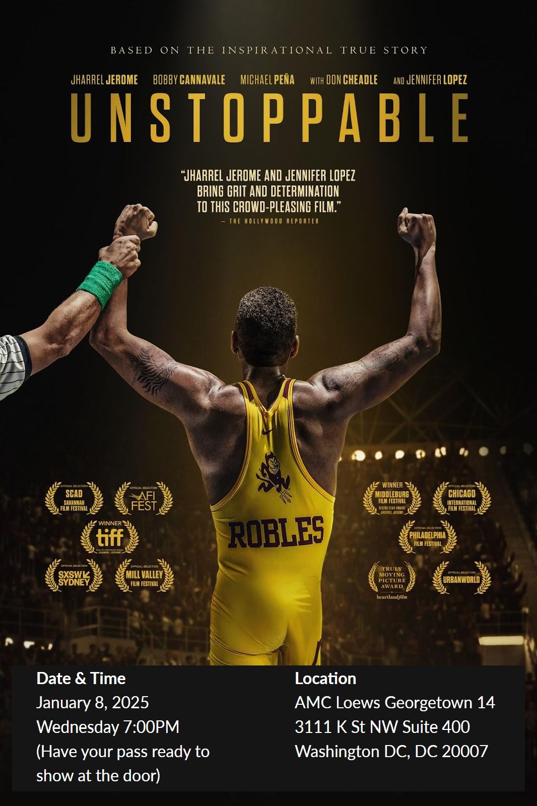 In the movie, “Unstoppable is the inspiring true story of Anthony Robles (Jharrel Jerome) who was born with one leg but whose indomitable spirit and unbreakable resolve empowered him to defy the odds and pursue his dreams. With the unwavering love and support of his devoted mother Judy (Jennifer Lopez) and the encouragement of his coaches, Anthony fights through adversity to earn a spot on the Arizona State Wrestling team. But it will demand everything he has, physically and mentally, to achieve his ultimate quest to become an NCAA Champion.”