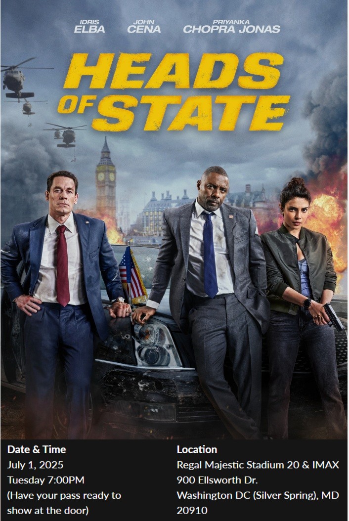 Giveaway time! BB is giving away tickets to an advance screening of Amazon MGM’s new action-comedy, Heads of State, starring John Cena and Idris Elba. The screening will take place on Tuesday, July 1, at 7:00pm EST at the Regal Majestic Stadium 20 & IMAX in Silver Spring, MD.